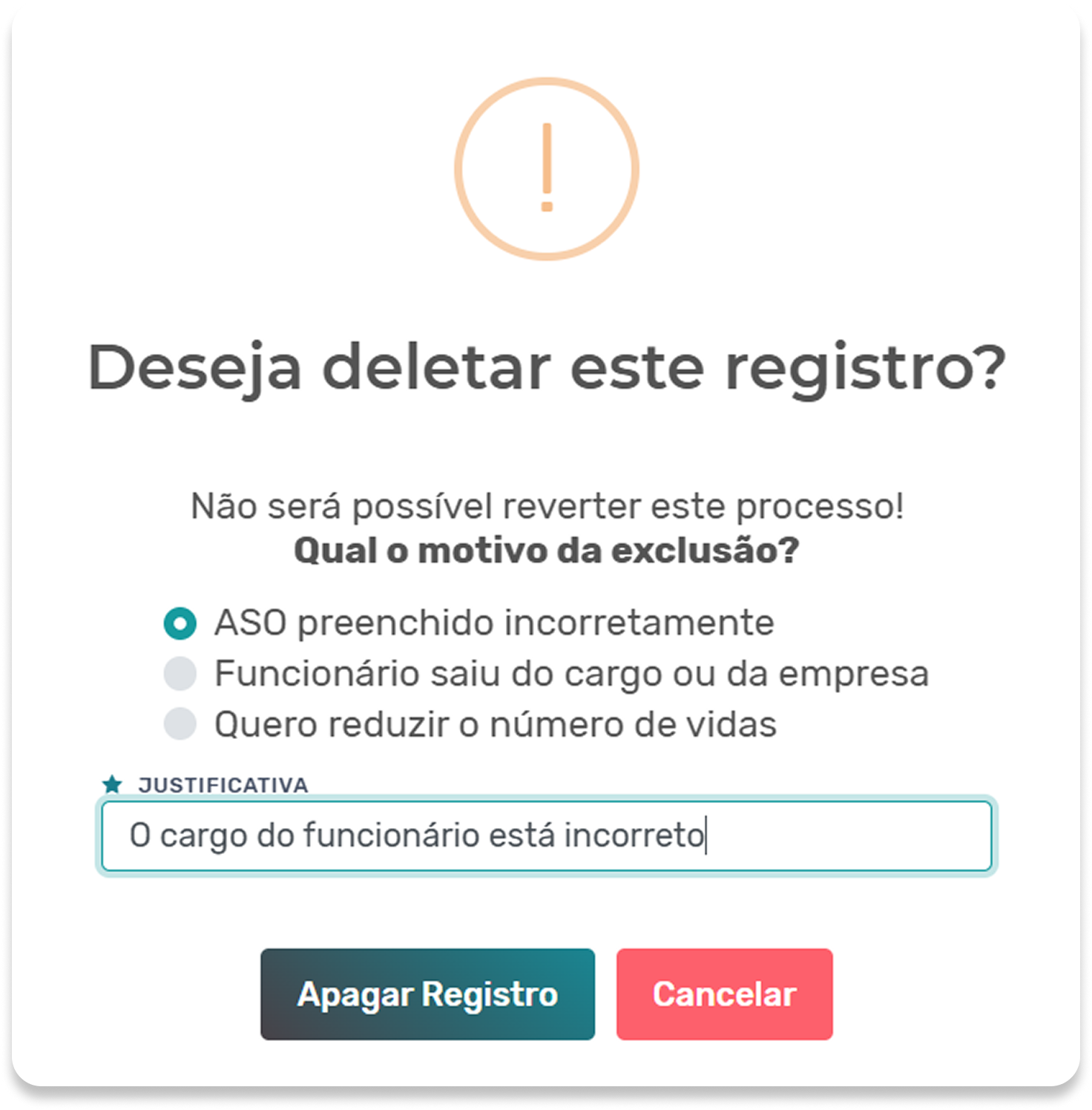 Agora ao excluir registros de saúde ocupacional como ASOs, atestados, guias de encaminhamento, prontuários, exames toxicológicos, CATs e audiogramas será necessário preencher uma justificativa.